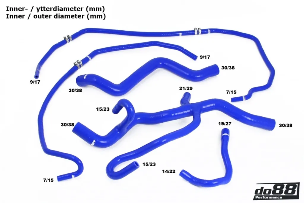 Slangarna är tillverkade i förstklassigt silikon med tre till fem lager textilarmering beroende på innerdiametern. Detta ger maximal motståndskraft mot tryck, värme och åldrande. Originalslangar i gummi spricker ofta över tid – do88:s silikonslangar erbjuder en permanent lösning med högre prestanda och längre livslängd.