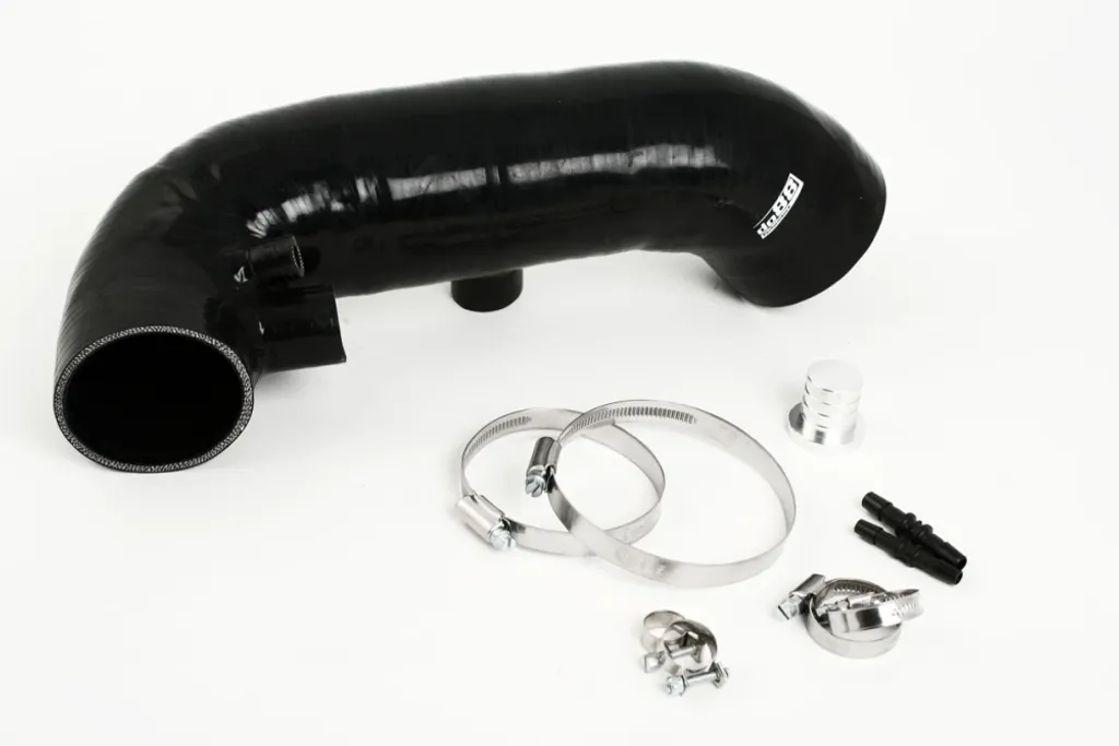 Slangen är tillverkad i högkvalitativt silikon med invändig stålwireförstärkning som förhindrar hoptryckning vid höga undertryck. Den är utformad med originaldimensioner vid anslutningarna för enkel montering: 84 mm (3,25") mot luftmassemätaren och 71 mm mot turbon. Ett 25 mm uttag för återcirkulation av dumpventil finns på undersidan, komplett med plugg för användning utan by-pass-ventil.