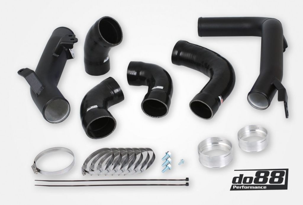 Rören är tillverkade av extruderat aluminium som dornbockats för exakt passform på Volvo SPA-plattformen. De medföljande silikonslangarna i färgen Svart består av fyra lager polyester-/aramidarmering, vilket ger mycket hög tryck- och värmetålighet. Paketet levereras komplett med alla nödvändiga monteringsdetaljer och är en direkt ersättning för originalrören – ingen modifiering krävs.