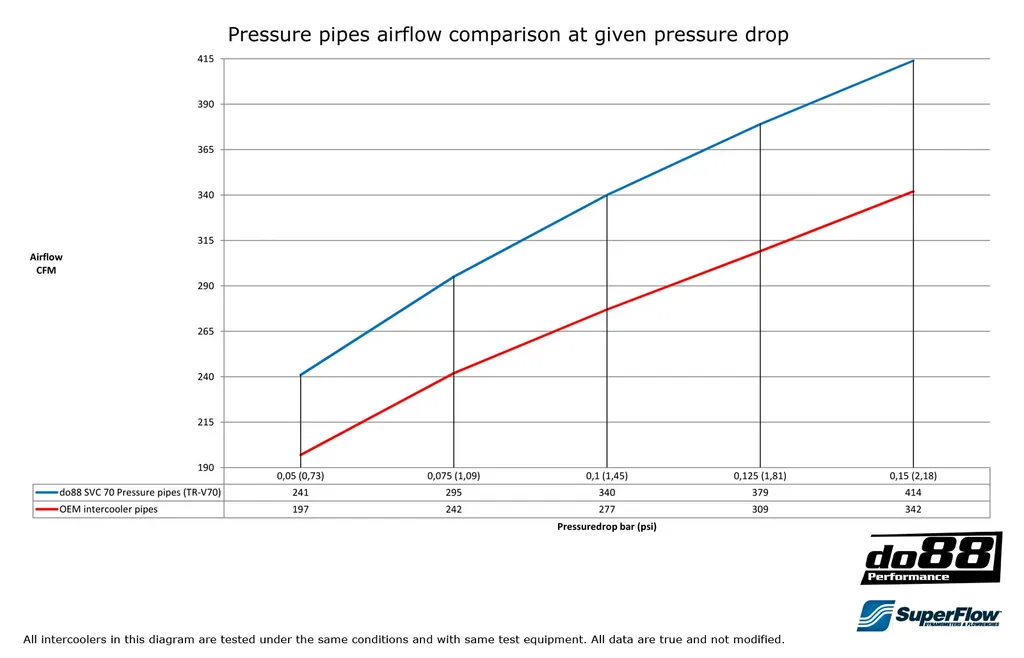 Detta diagram visar luftflöde vid olika tryckfall för do88 tryckrör jämfört med original tryckrör: