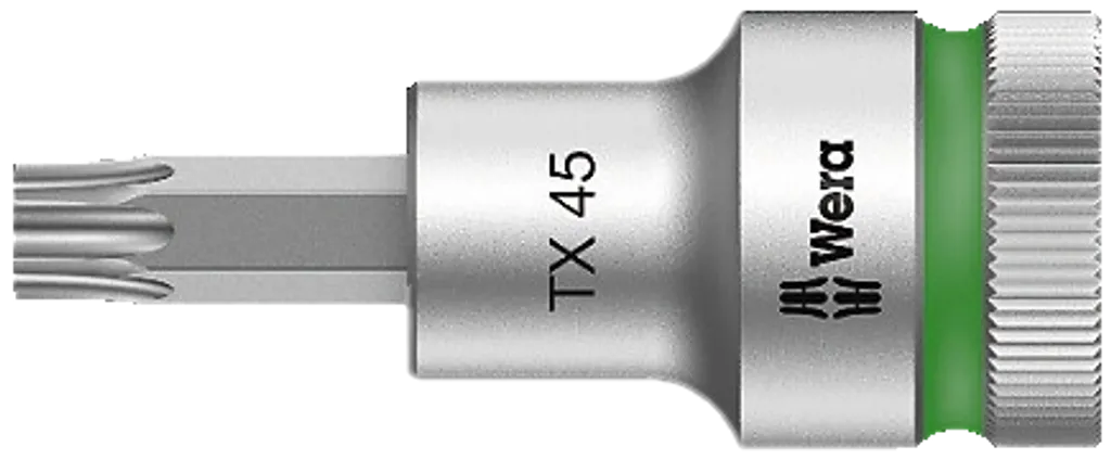 WERA 8767 C TORX HF är robusta 1/2" bithylsor med integrerad hållfunktion, anpassade för säkert och exakt arbete med TORX-skruv.