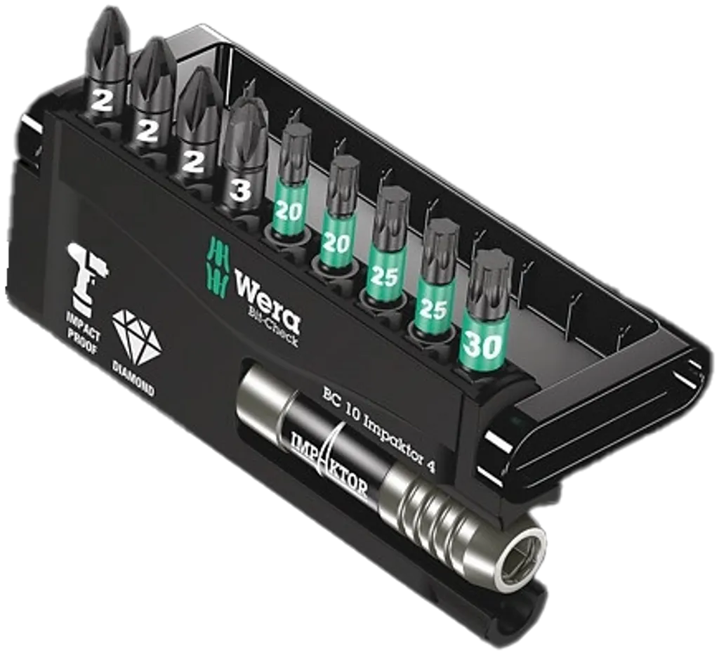 WERA Bit-Check 10 Impaktor 4, WERA PZ2 bits Impaktor, WERA Rapidaptor hållare, bits för slagskruvdragare, diamantbelagda bits WERA