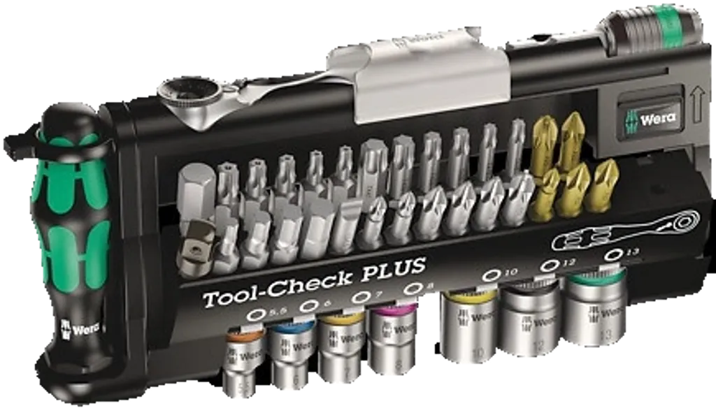 wera tool-check plus, bitsats med spärrnyckel, kompakt verktygssats wera, rapidaptor bitshållare, verktygssats för service, trendab
