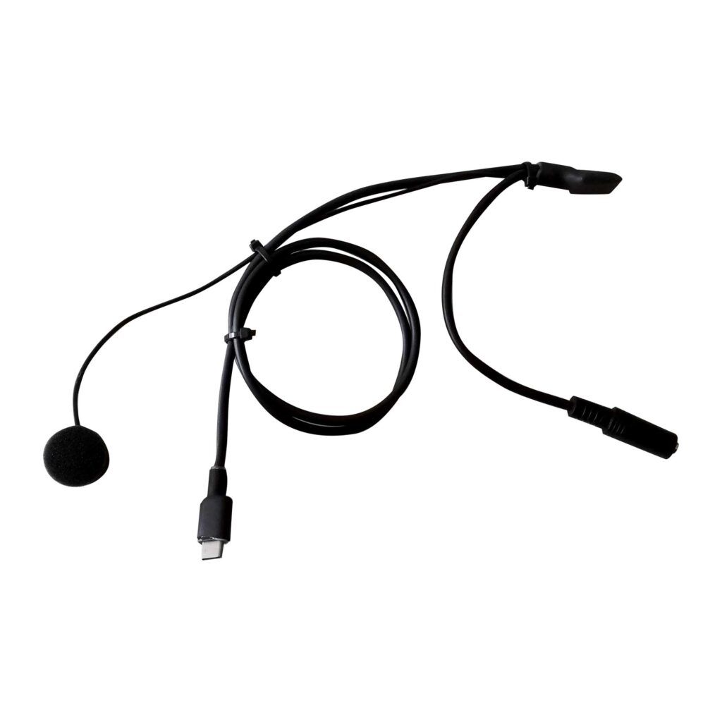 Kitet är utrustat med USB-C-anslutning för direktkoppling och en 3,5 mm stereoplugg för anslutning av öronproppar eller hjälmhögtalare. Tack vare den hjälmkompatibla konstruktionen kan mikrofonen enkelt monteras i fullface-hjälmar utan att påverka passform eller komfort.